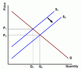When a new restaurant opens, there is an influx of people who want to try the new restaurant, instead of eating at the same ones they always have. This does not change the demand for restaurants, just the supply. As seen in the graph below, the demand curve (D) does not move, but the original supply curve (S1) moves to the right, creating a new supply curve (S2). This is because there are now more choices for a restaurant. As you can see on the graph, when demand stays the same and supply is increased, the equilibrium price goes down.